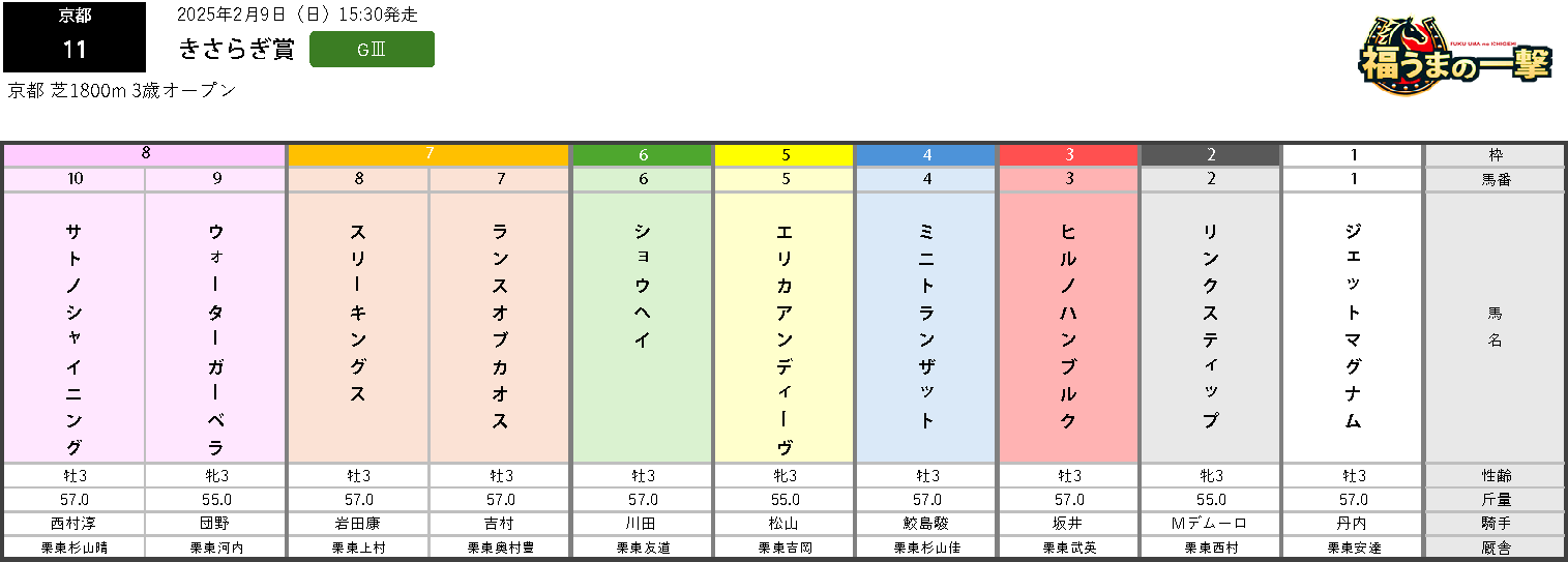 福うまニュース2月9日に京都競馬場で行われる、きさらぎ賞(3歳・GⅢ・芝1800m)の枠順が確定した。