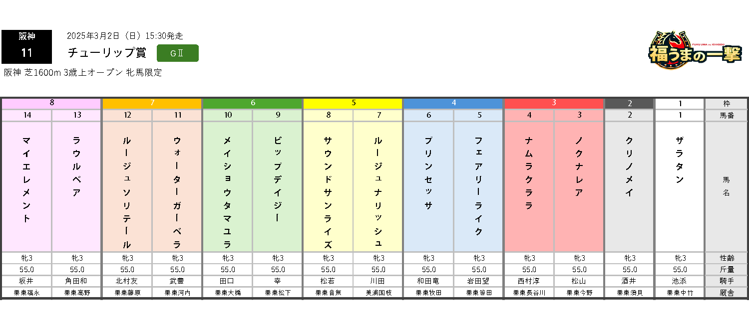 3月2日(日)に阪神競馬場で行われるチューリップ賞(3歳牝馬限定・G2・芝1600m)の枠順が確定した。