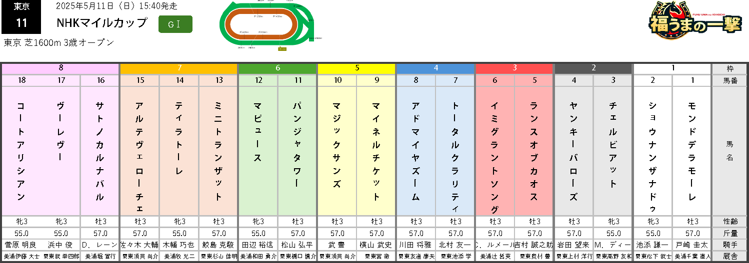 5月11日(日)に東京競馬場で行われるNHKマイルカップ(3歳以上オープン・GⅠ・芝1600m)の枠順が確定した。