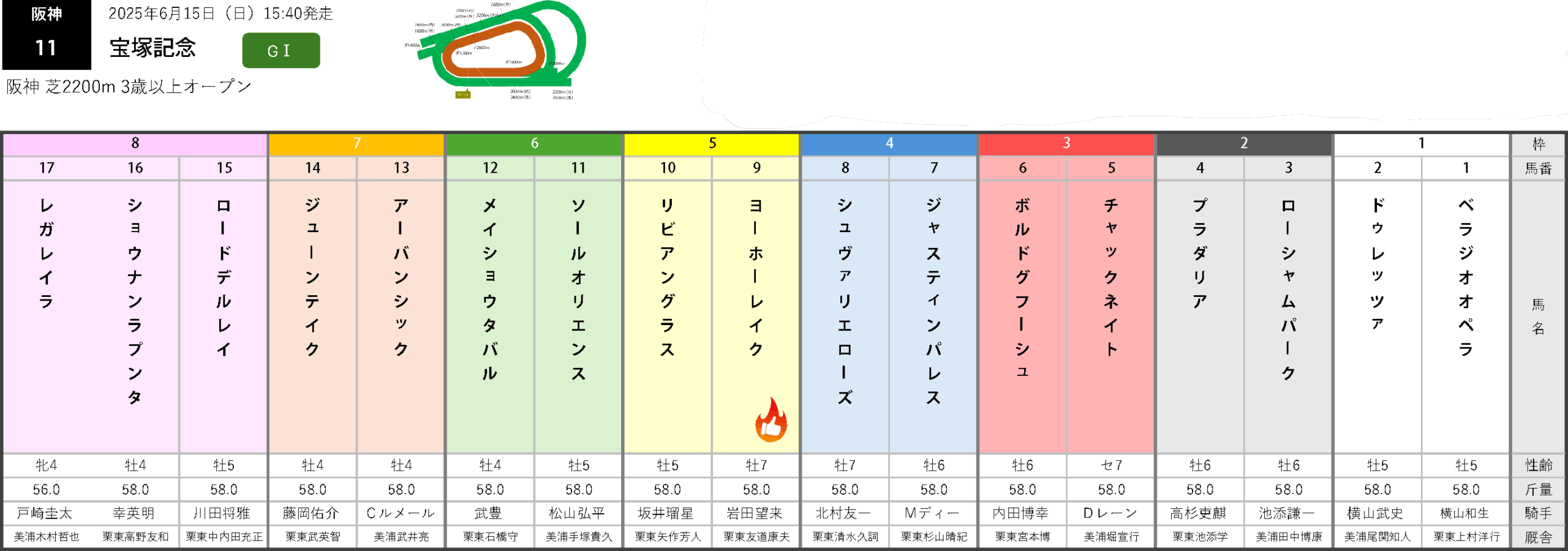 宝塚記念6月15日(日)に阪神競馬場で行われる宝塚記念(3歳以上オープン・GⅠ・芝2200m)の枠順が確定した。昨年の有馬記念の勝ち馬レガレイラは8枠17番の大外枠に入った。大阪杯を連覇したべラジオオペラは1枠1番。アーバンシックは7枠13番に入った。