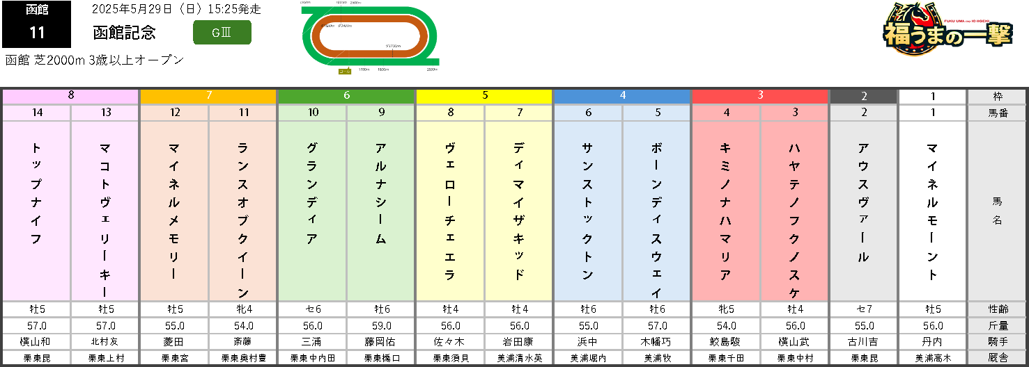 函館記念(GⅢ)の競馬新聞【無料】【予想付き】 福うまニュース X Facebook はてブ Pocket LINE コピー 2025.06.27 スポンサー 6月29日(日)に函館競馬場で行われる函館記念(3歳以上オープン・GⅢ・芝2000m)の枠順が確定した。 【函館記念】その他の記事 函館記念(GⅢ)の競馬新聞【無料】【予想付き】 (投稿日: 2025-06-27)