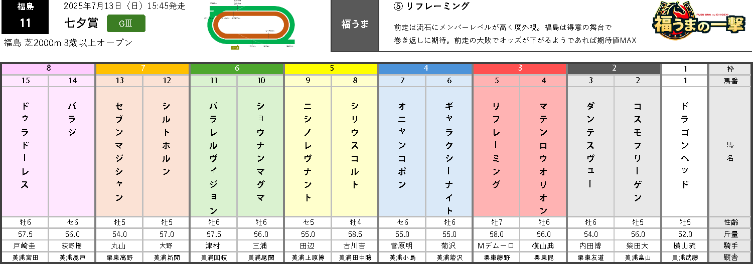 7月13日(日)に福島競馬場で行われる七夕賞(3歳以上オープン・GⅢ・芝2000m)の枠順が確定した。